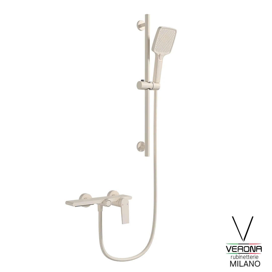 Sen tắm nóng lạnh – Sen cấp bồn gắn tường có thanh trượt chỉnh độ cao tay sen, tay sen tắm cỡ lớn có chế độ massage, thân sen tích hợp kệ đồ